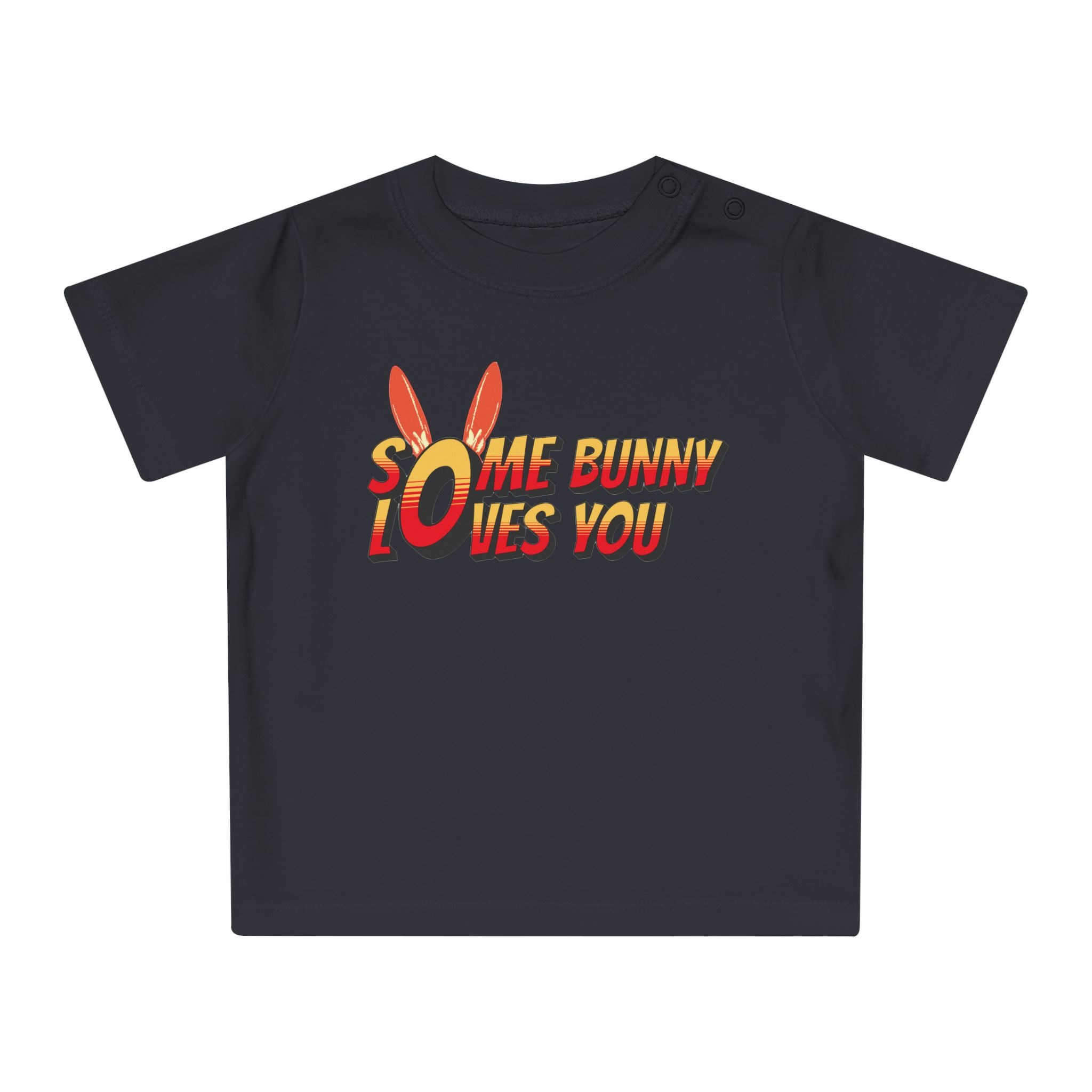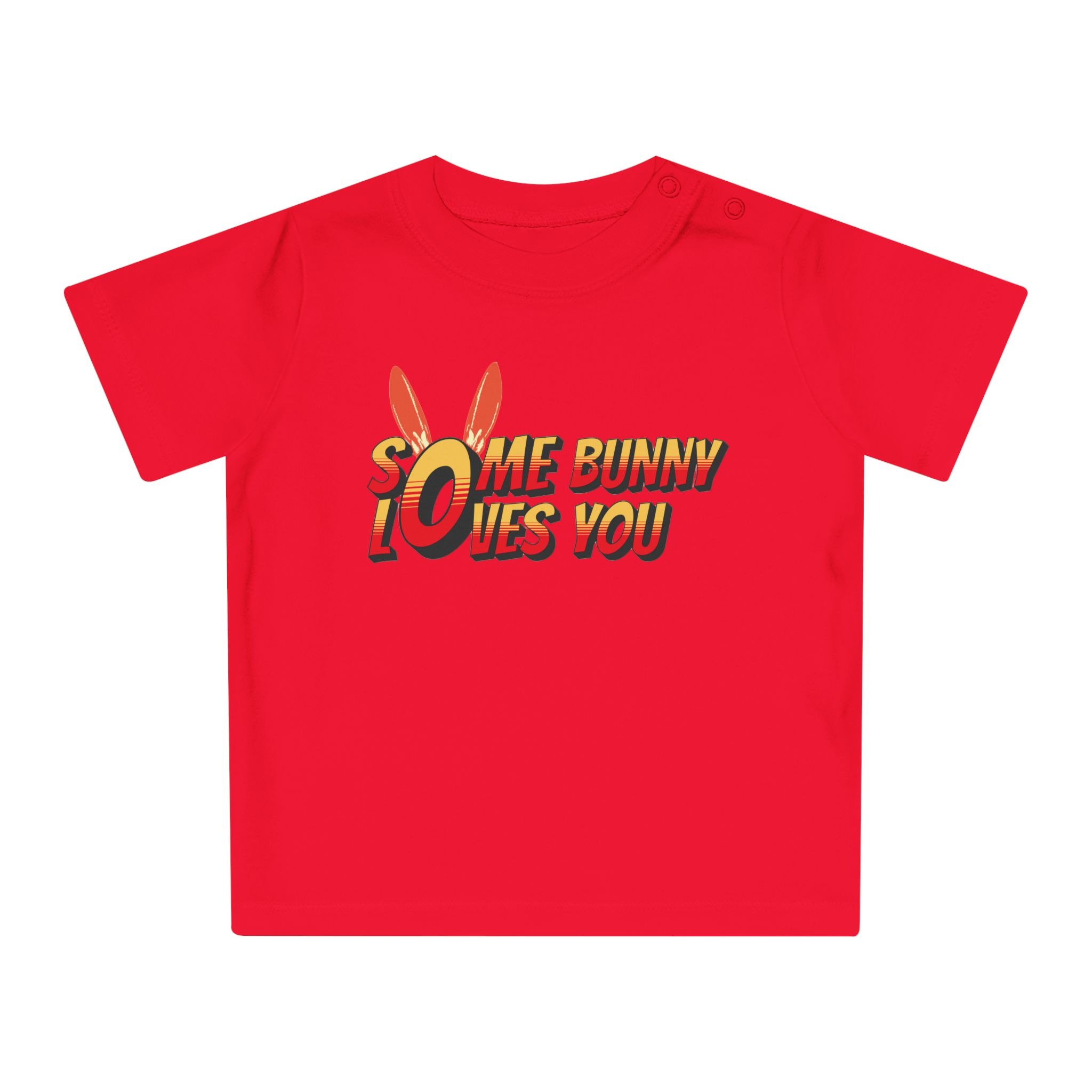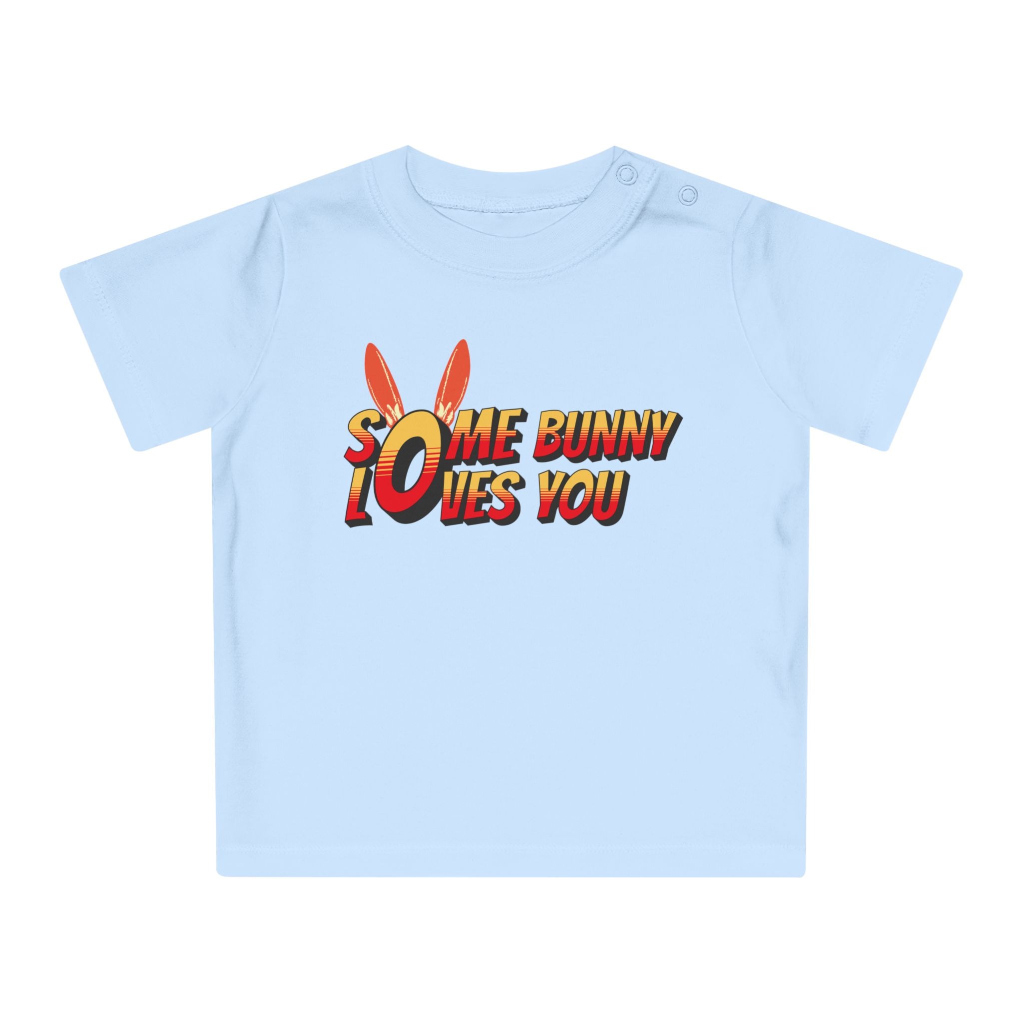 Soft, playful, and gentle — this baby tee brings a burst of sunshine to little wardrobes. The short-sleeve design features easy shoulder snaps and a stretchy ribbed collar so dressing and undressing stays calm and quick. Printed with a cheerful, comic-style “Some Bunny Loves You” motif and subtle bunny ears, it feels like a tiny hug every time it’s worn. The medium-weight organic cotton fabric is breathable and holds shape through washes, making it a cozy everyday layer for naps, playtime, or family photos. Thoughtfully finished with sewn-in labels and compliant materials, it’s made to be safe and simple for parents while keeping baby comfortable and adorable.