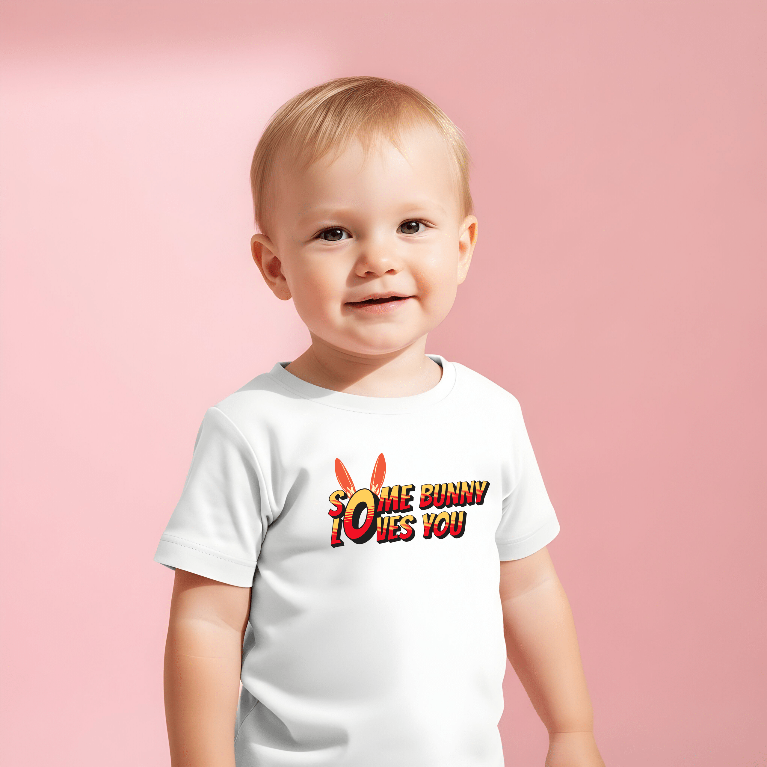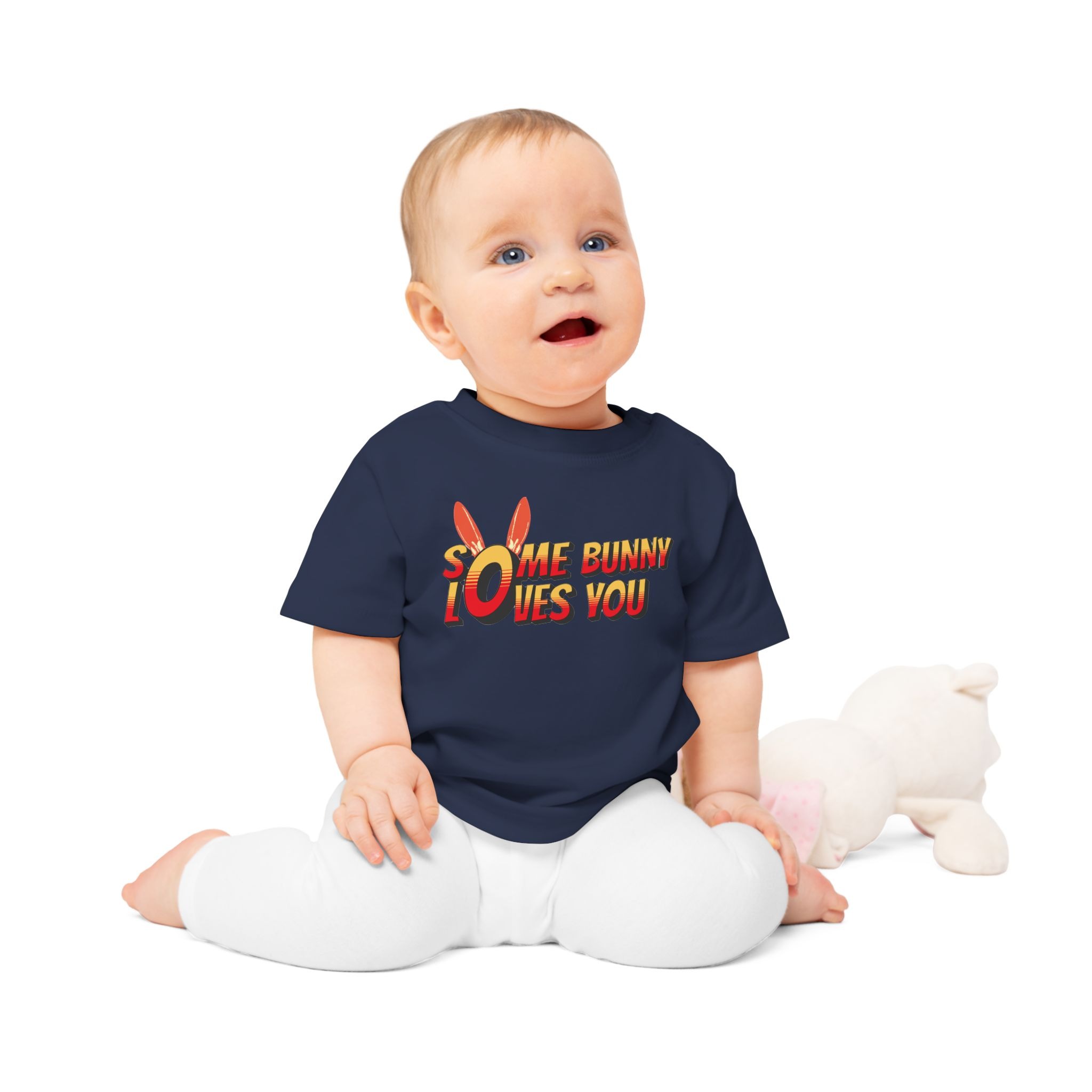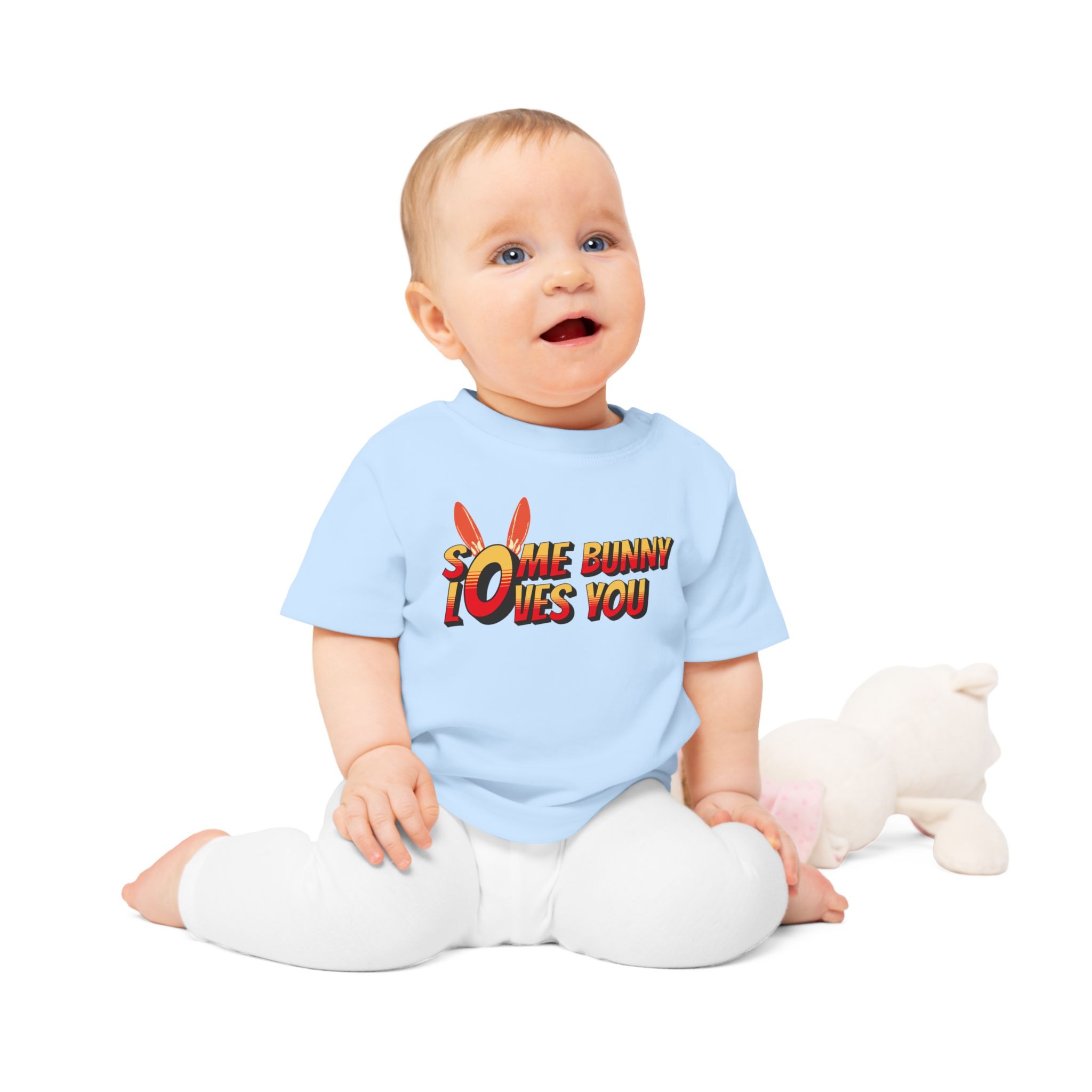 Soft, playful, and gentle — this baby tee brings a burst of sunshine to little wardrobes. The short-sleeve design features easy shoulder snaps and a stretchy ribbed collar so dressing and undressing stays calm and quick. Printed with a cheerful, comic-style “Some Bunny Loves You” motif and subtle bunny ears, it feels like a tiny hug every time it’s worn. The medium-weight organic cotton fabric is breathable and holds shape through washes, making it a cozy everyday layer for naps, playtime, or family photos. Thoughtfully finished with sewn-in labels and compliant materials, it’s made to be safe and simple for parents while keeping baby comfortable and adorable.